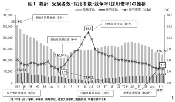 団塊世代の退職や少人数制クラス導入もあり、教職員採用枠は全国的に以前に比べて増えていますが、採用試験の倍率は年々低下しています。