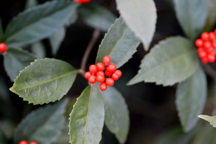 少し個性的な植物を置くなら、赤い実がつくマンリョウやセンリョウもオススメ。これからのシーズンにぴったりの常緑低木です。日陰でも育てられることから、北側の玄関や植え込み、マンションの玄関先でも育てやすいでしょう。