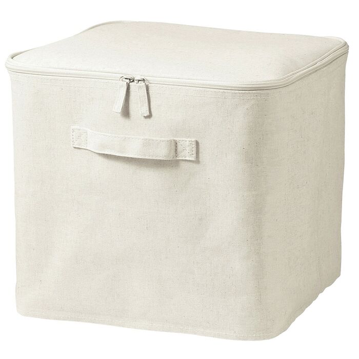 生地の内面をコーティングした布製ボックス。豊富なサイズ展開があり、フタ付きのタイプもあるため、スペースや収納したいものによって使い分けることができます。