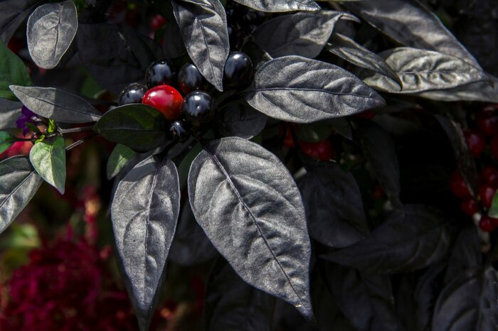 観賞用トウガラシはカラフルなレッドやイエロー、オレンジの実が可愛らしい植物。枝や葉が銅葉の品種「ブラックパール」「パープルフラッシュ」は大人っぽい雰囲気がオシャレ。ハロウィンの寄せ植えにも加えてみたい品種です。