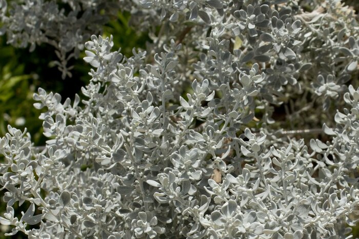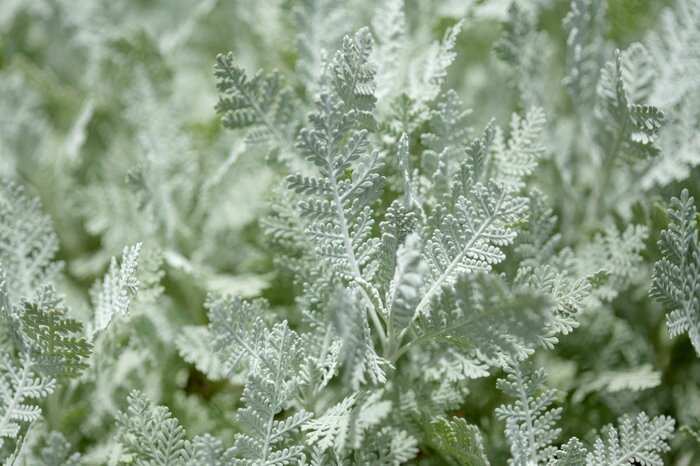 シルバーレースやオレアリアなどのシルバーリーフ系の植物はレース状の葉がアクセント。くもの巣のようなイメージで植えてみるのもいいですね。少し物足りないときにも加えてみるとよいでしょう。