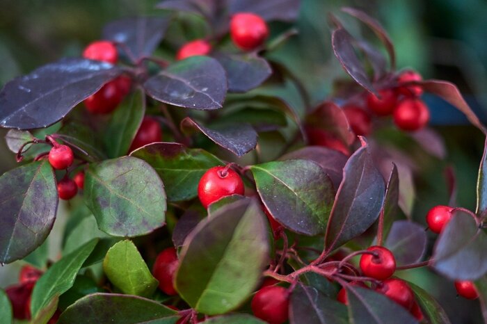 大きなピンクやレッドの実が可愛らしいチェッカーベリー。近年は冬の寄せ植えにも多く取り入れられています。