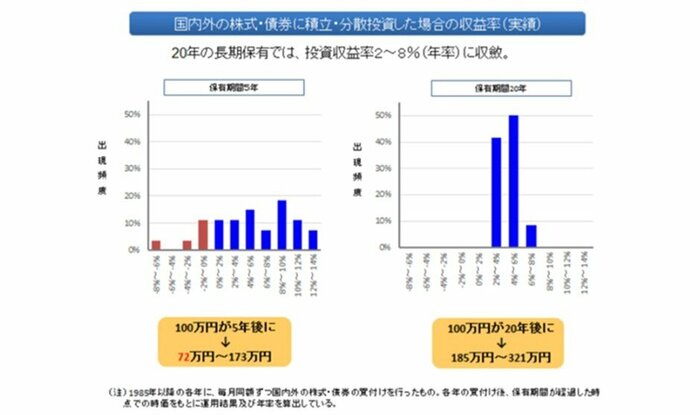 つみたてNISAの仕組みは、「長期・積立・分散投資」というリスクを抑える3原則を実践しています。金融庁のデータによると、一般的な国内外の株式ファンドで運用した場合、20年の長期投資なら損失が出ておらず、安定したリターンが期待できるという結果がでています。