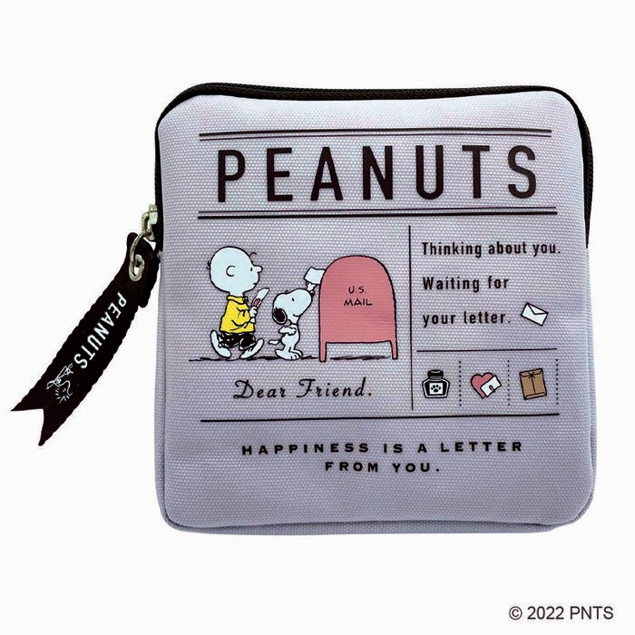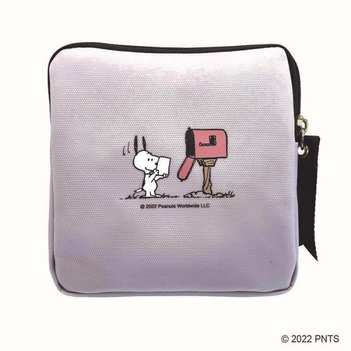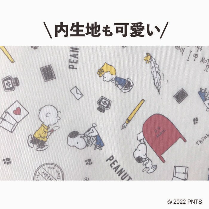 正方形でフラットタイプのポーチは、コスメや充電器などを入れるのにちょうどいいサイズ感。収納力もあるため、お出かけバッグのお供におすすめです。内生地はスヌーピーやキャラクターたちの総柄デザインになっており、開けるたびにときめきます。