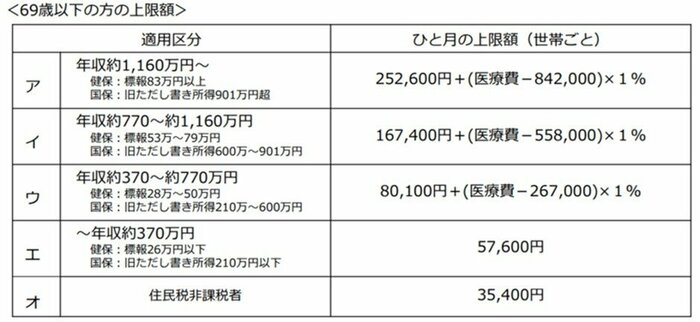 肝心の上限額は、年齢や所得によって変わります。たとえば69歳以下で年収が360万円であれば、1月の上限額は5万7600円に収まります。