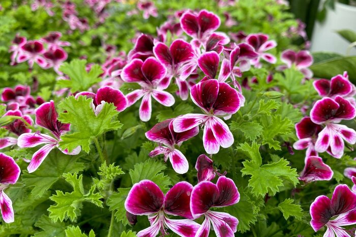 ゼラニウムにはない花色や斑が入るペラルゴニウム。バイカラーやグラデーションが魅力的な品種を見つけやすいでしょう。