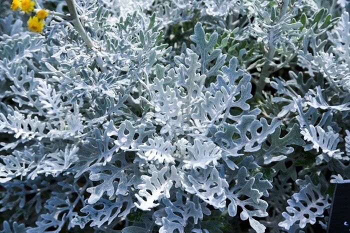 シロタエギクは白銀色の葉がクールな印象。シルバーリーフの代表格で、葉に深く入る切れ込みがキレイです。