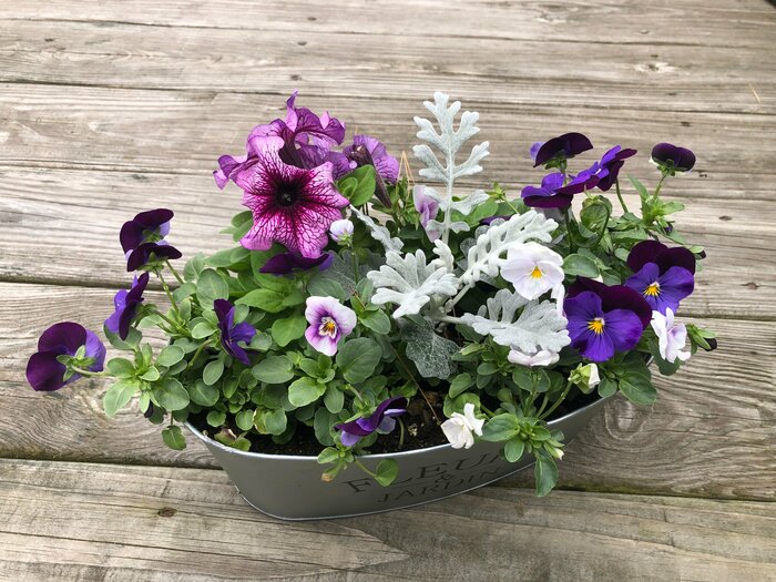 パープルのビオラとペチュニア、シロタエギクの組み合わせ。