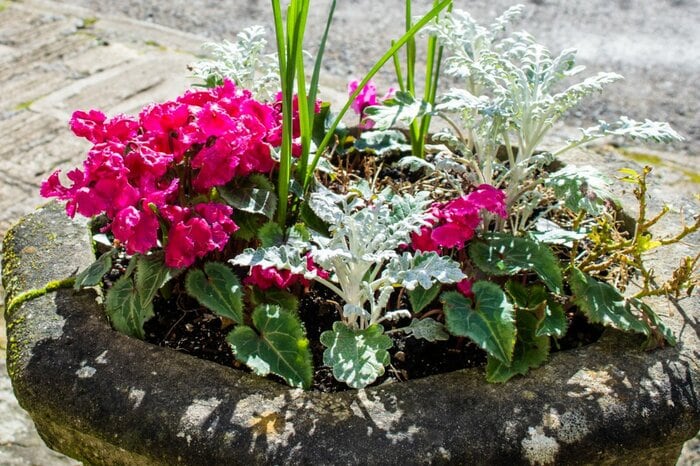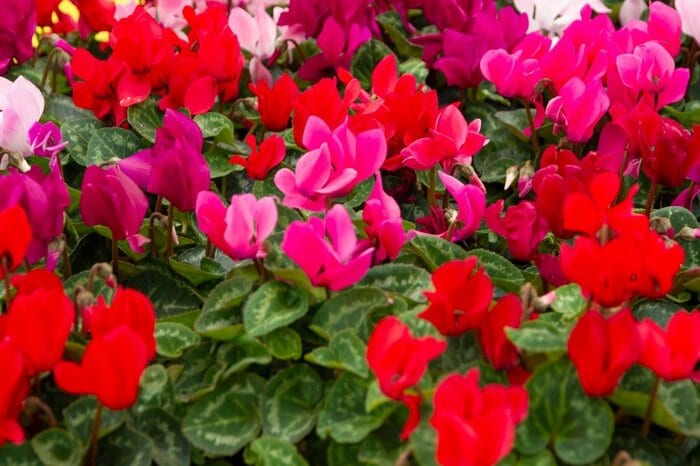 室内栽培向きのシクラメンを屋外で栽培できるように改良して作出されたのがガーデンシクラメン。ガーデンシクラメンは多年草で、秋から冬にかけてレッドやピンク、ホワイトの美しい花を咲かせます。
