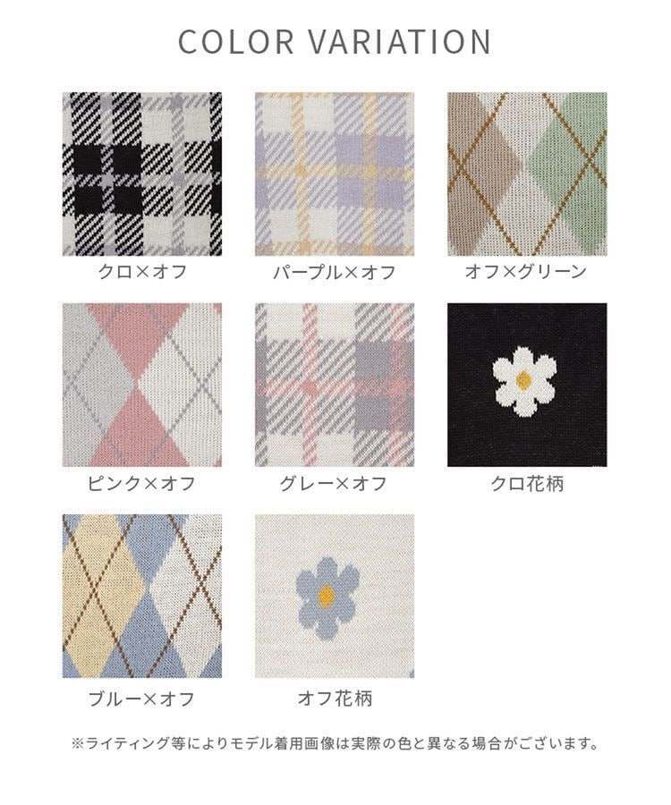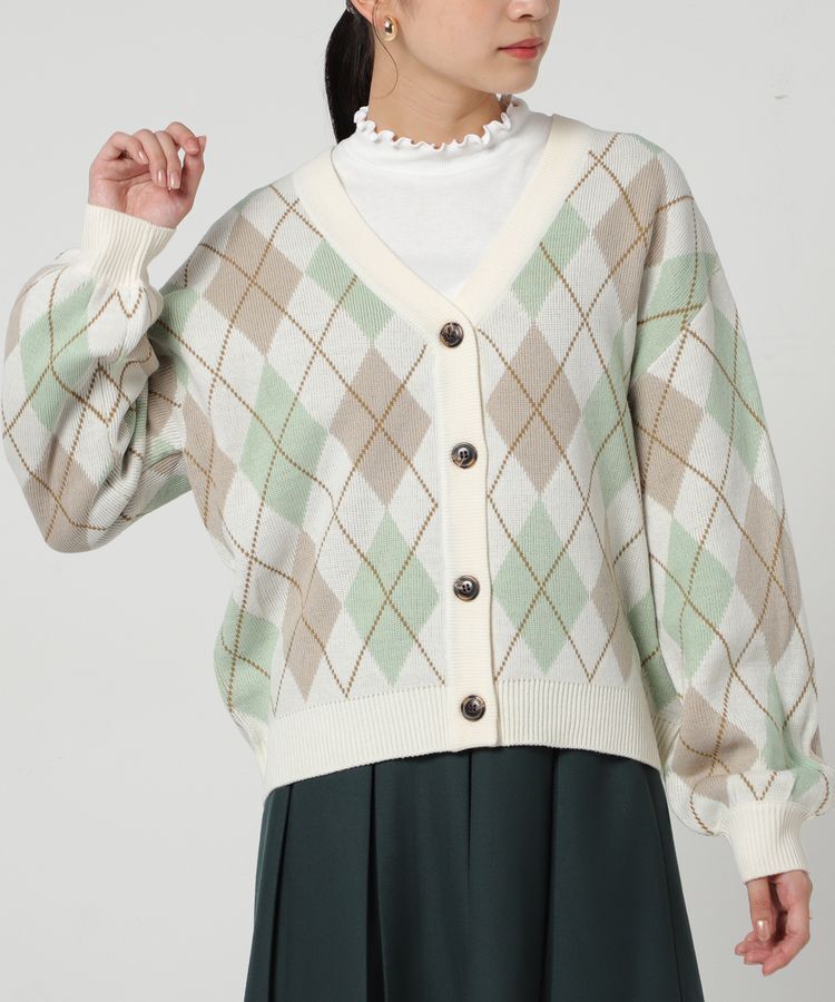 こちらの「オフ×グリーン」のアーガイル柄も素敵です。上品な雰囲気が出るので、オフィスコーデにも使いやすいアイテムといえるでしょう。