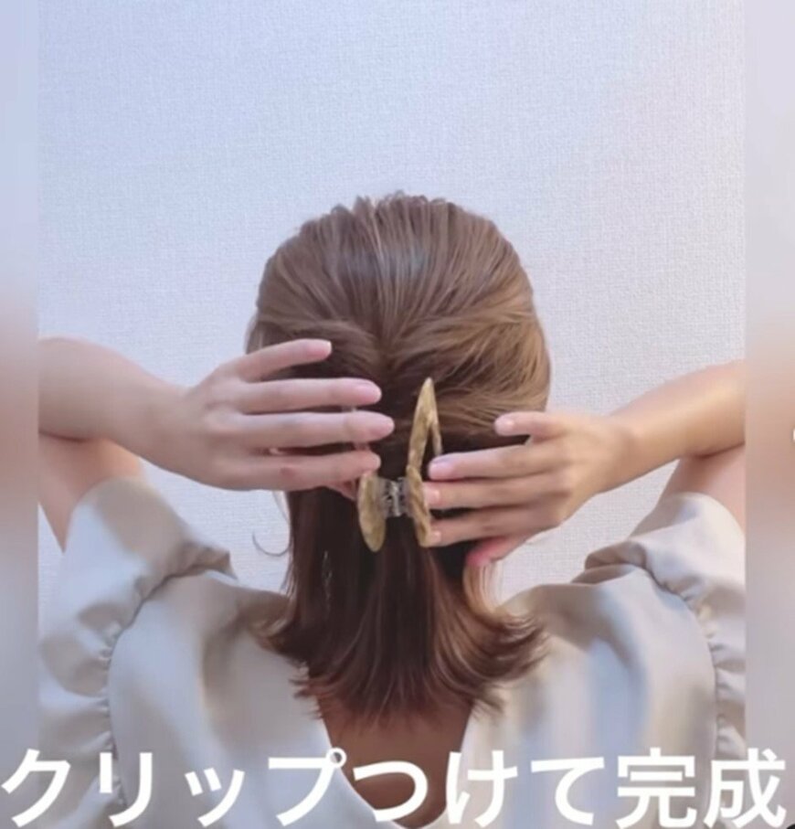 続いて耳上までの髪をとって、先ほど結んだゴムの上で結びます。このときも真ん中はとらず、両サイドだけとるのがコツです。