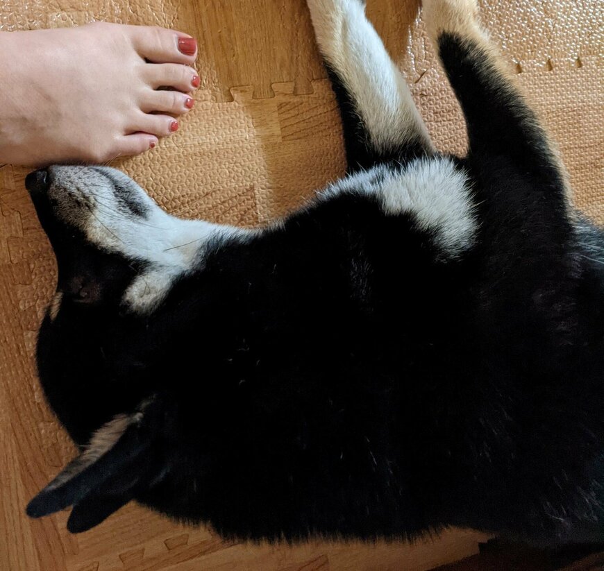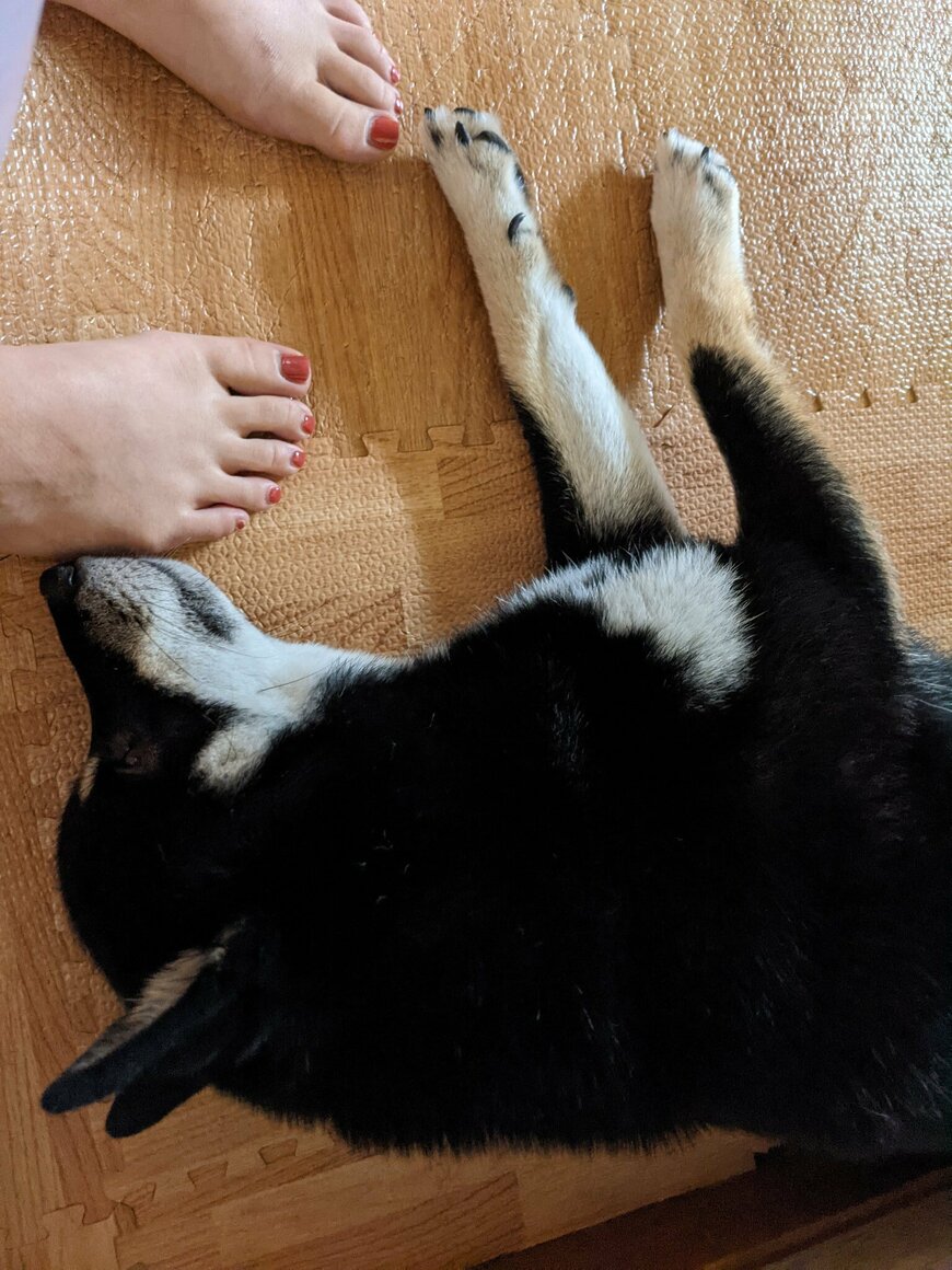 ゴロンと横になって密着するワンちゃんからは警戒心が感じられず、とことんリラックスしている様子が伝わってきます。