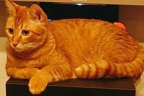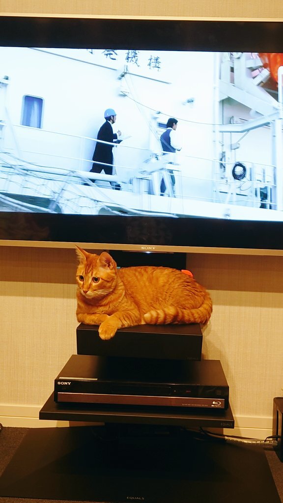 写っているのは、大きな画面のテレビ。そしてテレビ前の真ん中には、1匹の猫ちゃんが座っています。