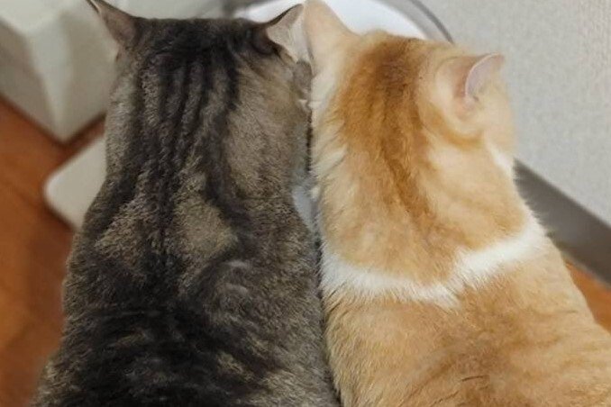 1つのお皿で水を飲んでいるのでしょうか、顔がぴったり密着していますね。仲のよさが伝わる2匹の姿からは、「一緒に飲もうニャー」なんて微笑ましい会話が聞こえてきそうです。