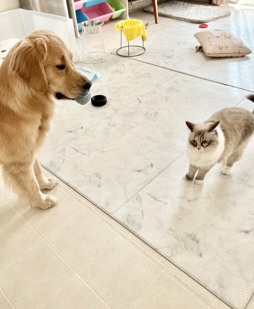 写真に写っているのは、ゴールデンレトリバーのぷぅちゃんと、ラガマフィンのお茶子ちゃん。ぷぅちゃんが咥えていたのは「猫のおもちゃ」だったようで……?