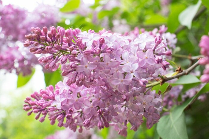 枝先に紫の小花を穂状に咲かせるライラックは落葉高木。パープルやホワイトの花色があり、甘い香りも楽しめます。鉢植えでも育てることができ、近年は耐暑性のある矮性品種「ヒメライラック」も人気です。