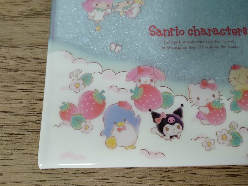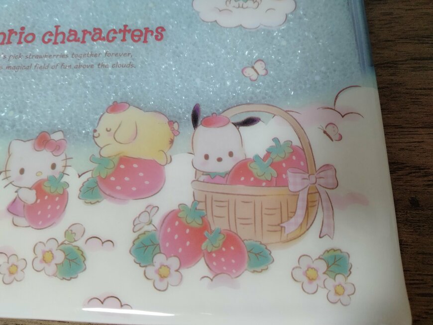 ポーチ下部右側では、「ハローキティ」と「ポムポムプリン」がイチゴと戯れています。その横で、イチゴのバスケットから「ポチャッコ」が顔を出しています。