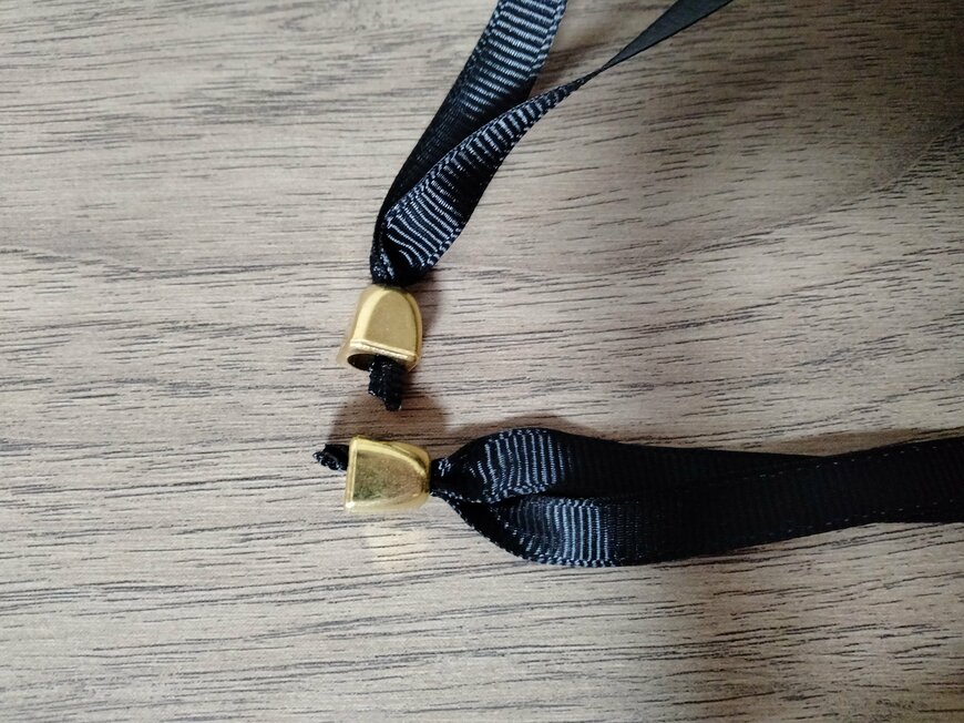 リボンの端には、ゴールドの飾りがついています。刺繍糸とリンクしたカラーで、シンプルながらオシャレな味わいがあります。