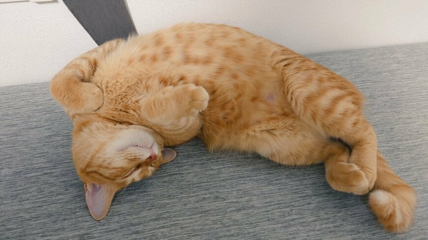 写真に写っているのは、もふもふとした毛並みが印象的な茶トラ猫ちゃん。大胆に披露しているフワモコのお腹に、思わず目を引かれてしまいます。