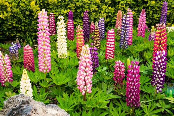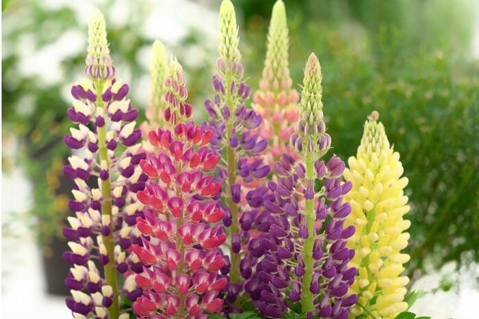 ルピナスはフジによく似た花がとても豪華。まっすぐに立ち上がる茎に無数の花を咲かせ、花穂は長いもので60センチほどにも。カラフルな花色が鮮やかで、群生させるとインパクトがあります。