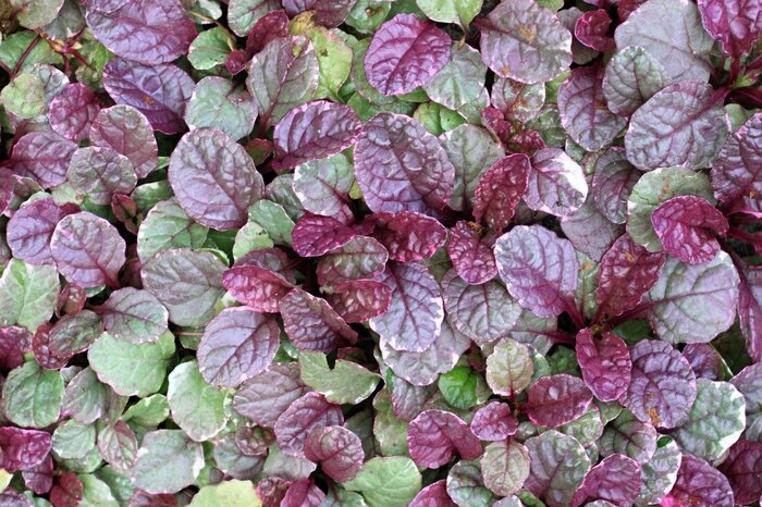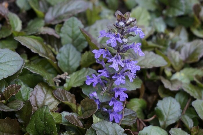 アジュガはほふくしながら横に広がり、グランドカバーに最適。多少日当たりに恵まれない場所でも、ランナーを伸ばしながら旺盛に繁殖します。10センチほどの高さで穂状に咲く青紫の花が可憐です。