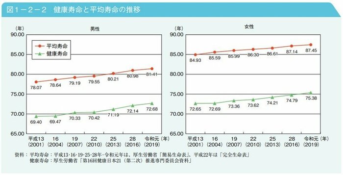 一方、「健康寿命」とは、「健康上の問題で日常生活が制限されることなく生活できる期間」のことをいい、2019年の健康寿命は男性72.68歳、女性75.38歳となっています。