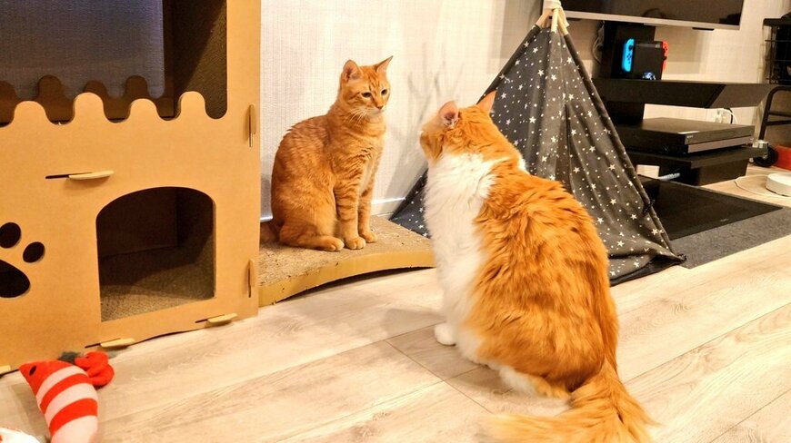 写真に写っているのは、部屋の一角で向き合う2匹の猫ちゃん。2匹とも姿勢よく座って、なにやら重要な会話をしているように見えます。