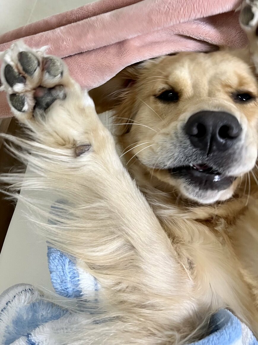 写真に写っているのは、ゴールデンレトリバーの女の子「ぷぅちゃん」。ツイートによると、1歳半を過ぎてようやくマッサージの魅力に気がついたそうです。
