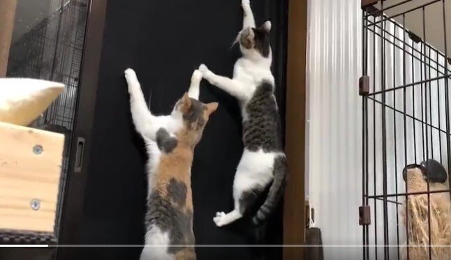 気配を感じ取ったようすの猫ちゃん達は、網戸にロックオンして虫を狙います。真っ先に網戸に登ったのは、グレーと白の毛並みが印象的な「セナちゃん」。三毛猫の「ノンちゃん」も、両手を広げて一生懸命に登っていますね。