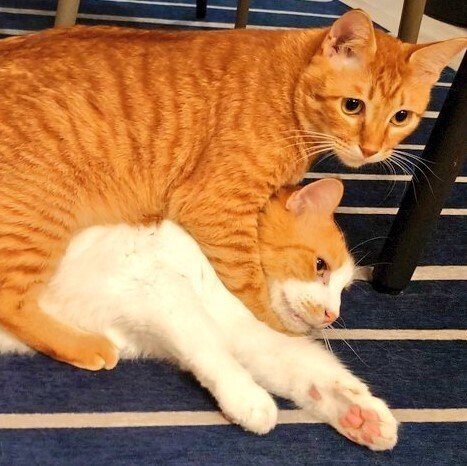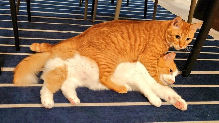写っているのは、モフっとした毛並みが印象的な猫ちゃんに、力強くまたがる茶トラの猫ちゃんです。