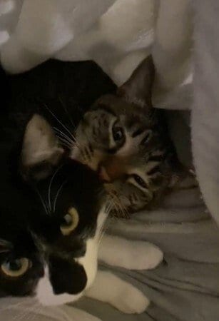 毛布の中をのぞいてみると、そこに身を潜めていたのは2匹の猫ちゃん。キジトラのシイタケくんが、ハチワレのモズクちゃんを一生懸命に毛づくろいしています……!