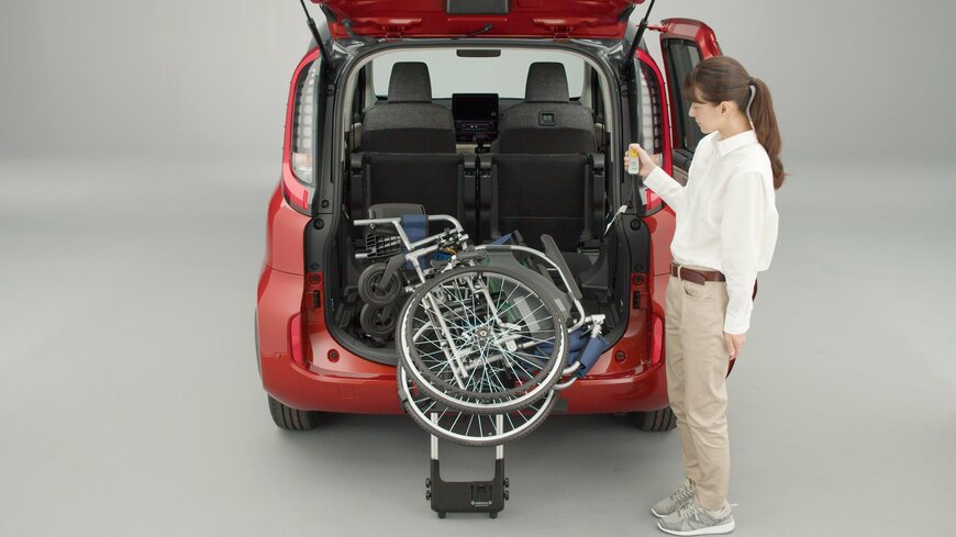 今回発売されたトヨタ純正の福祉用品「いつでもウェルキャブ」の車いす収納装置は、力が弱く車いすを持ち上げるのが難しい方でも、電動で容易に車いすをラゲッジスペースに収納できる装置です。