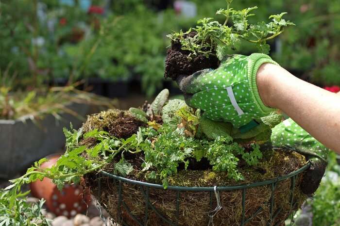 土はピートモスやバーミキュライトなどを多めに、鉢底石も発泡スチロールを代用してなるべく軽くしましょう。草花は背丈が低くこんもりと茂るタイプや、長くしだれるタイプがオススメです。