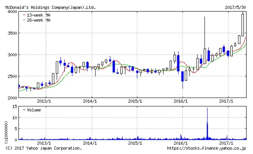 2016年以降、着実な株価上昇を見せていた日本マクドナルドHD(以下、マクドナルド)ですが、5月に入り株価はさらに急騰。3,500円近辺で推移していた株価が一気に4,000円近辺の水準にまで上昇しています。