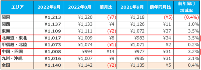 エリア別平均時給をみると、「北海道・東北」が1017円で前月比8円の増加、前年同月比34円の増加(増減率:+3.5%)しました。