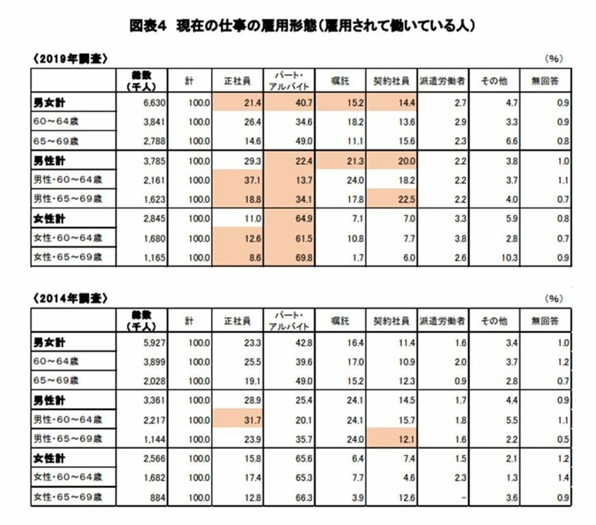 2014年の同調査と比べると、男性の正社員(60~64歳層)は31.7%から37.1%に増えています。