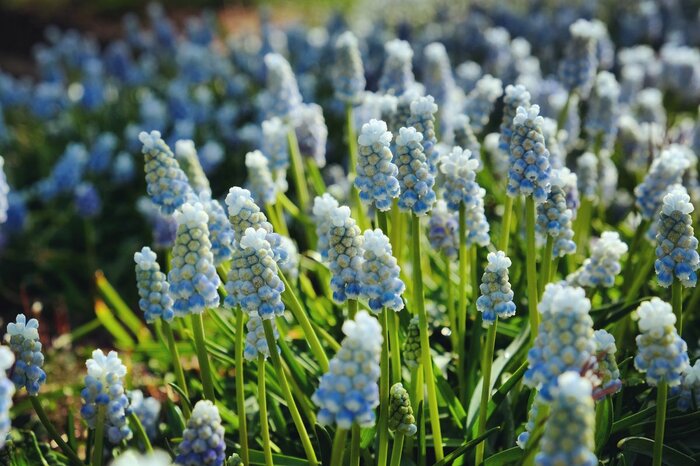品種改良が盛んなムスカリはお洒落な品種が続々作出されています。青と白のバイカラーの花色など、存在感のある品種は主役級の可愛らしさです。