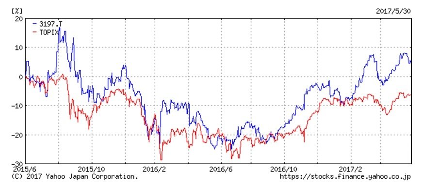 下図の通り、過去2年間の同社株(青線)をTOPIX(赤線)と比較してみました。両者はおおむね同じ方向に推移する傾向がありますが、2017年2月以降すかいらーく株がTOPIXをしっかり上回って推移するようになりました。