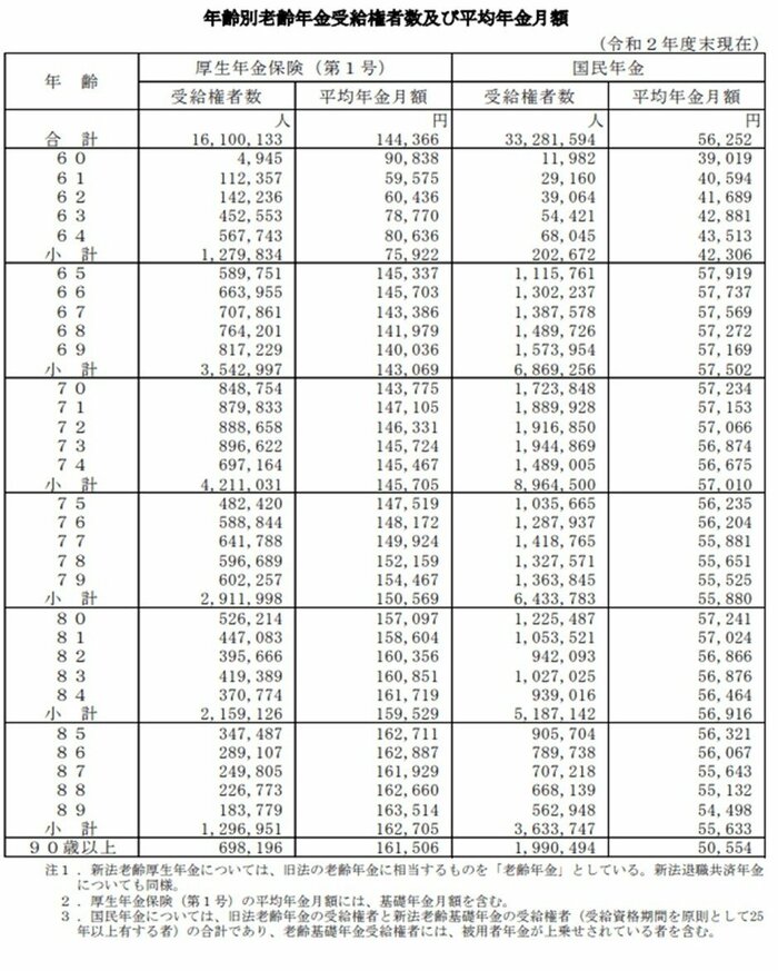 まずは厚生労働省の「令和2年度 厚生年金保険・国民年金事業の概況」もとに、70歳代の国民年金と厚生年金の金額を1歳ごとに見ていきましょう。