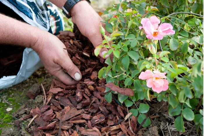 バークチップや藁、落葉などを使って、土の表面を覆います。バークチップや藁はホームセンターなどで手に入ります。落葉は自宅に落ちているもので構いませんが、虫がついておらず、病気になっていないものを使用しましょう。