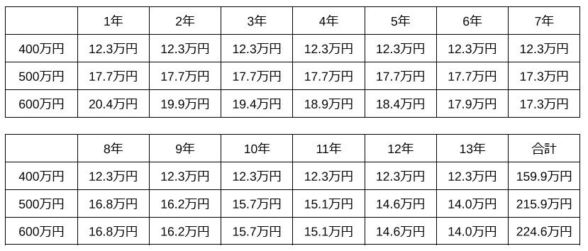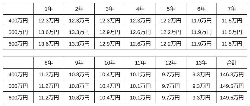 では年収400万円、500万円、600万円の毎年の控除額と13年間の合計額を、住宅ローンの借入額別に見てみましょう。