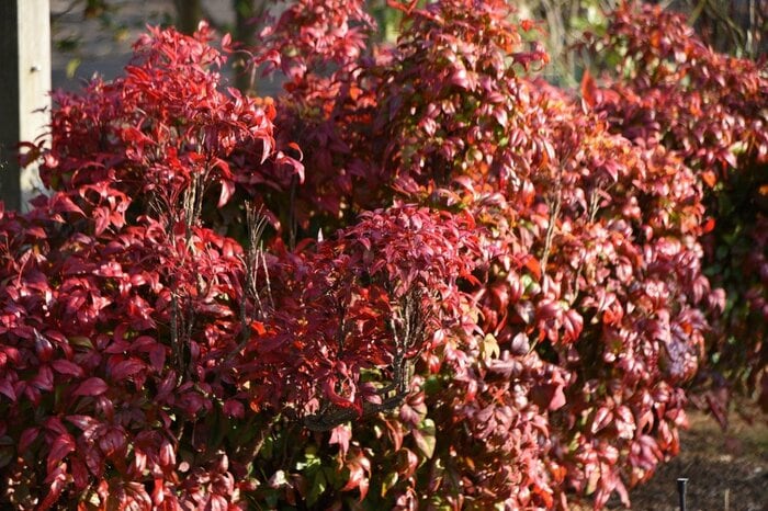 オタフクナンテンは、ナンテンの矮性品種で低めの樹高が特徴の常緑低木。落葉性ではないところがポイントで、紅葉するにも関わらず葉を落とさないため、生け垣に植栽されることが多い植物です。