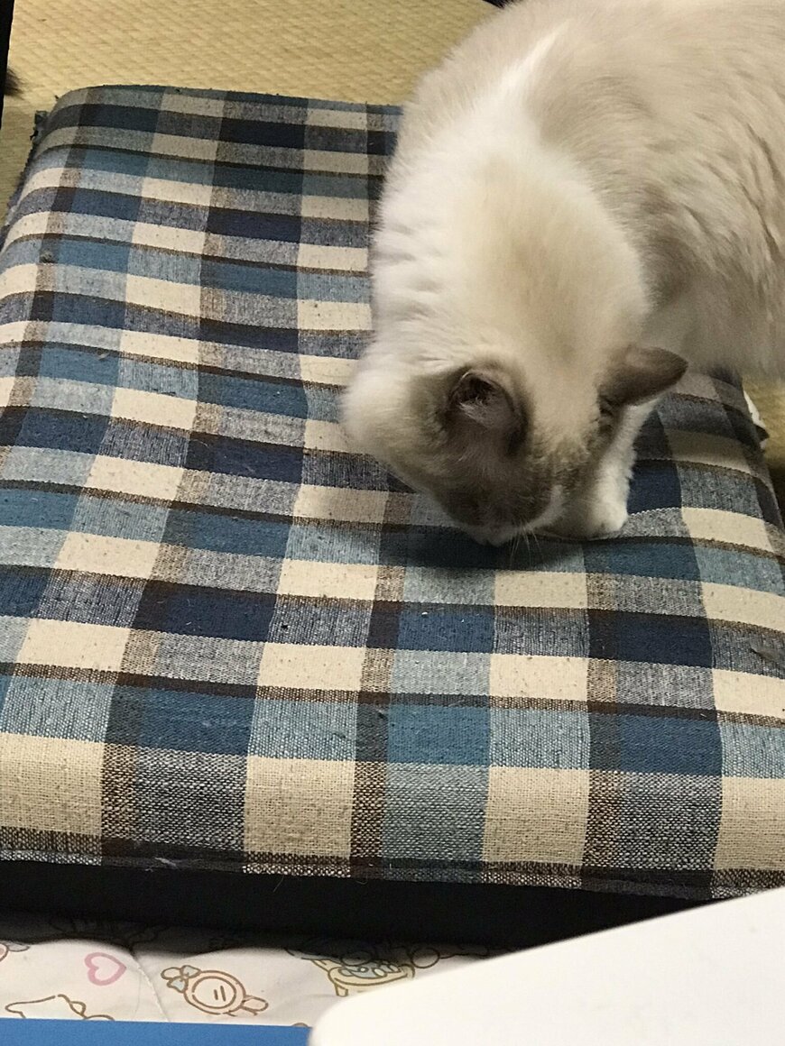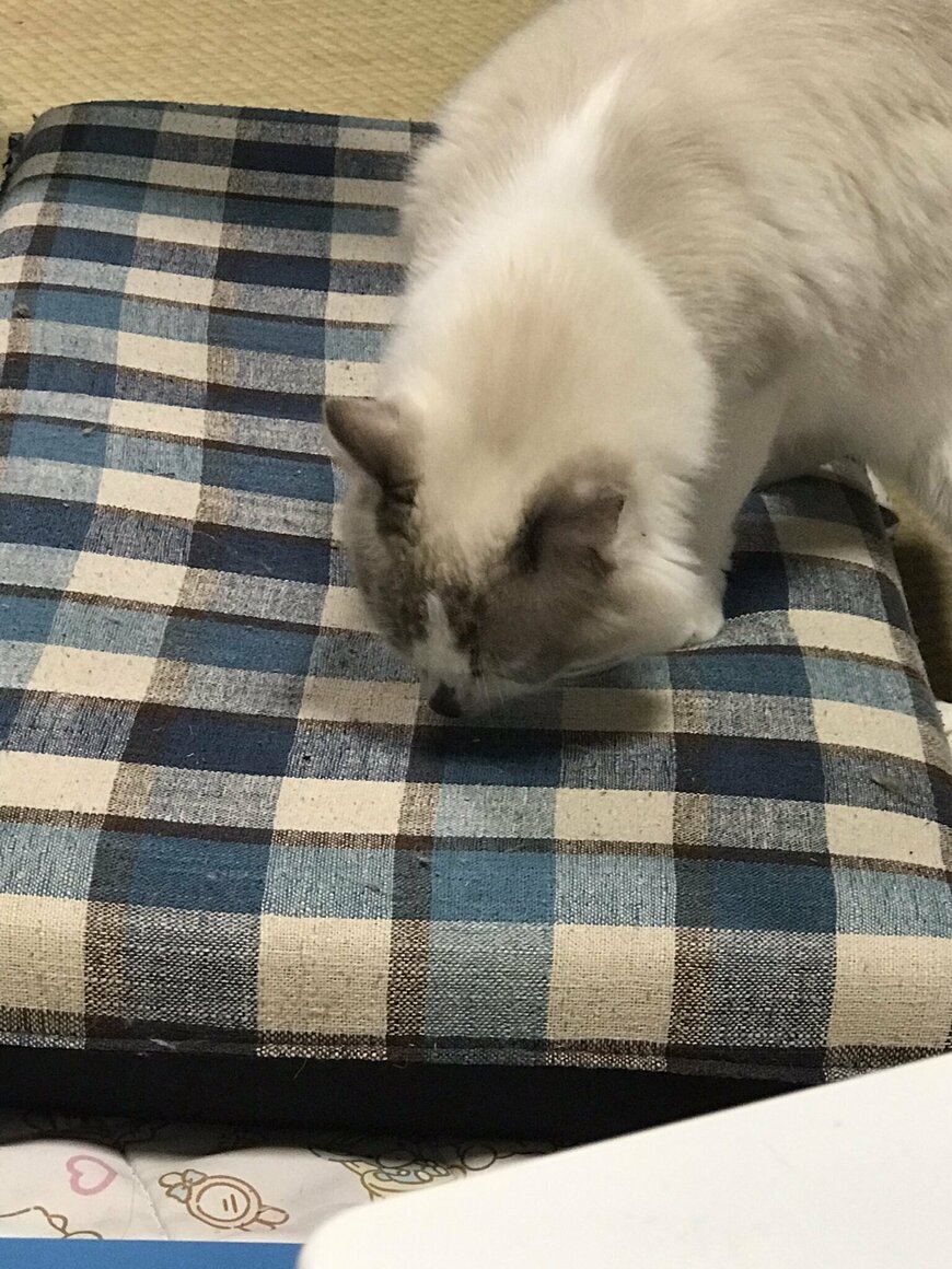 写真に写っているのは、ラグドールの保護猫サクラちゃん。青い座椅子を一生懸命クンクンしています……!