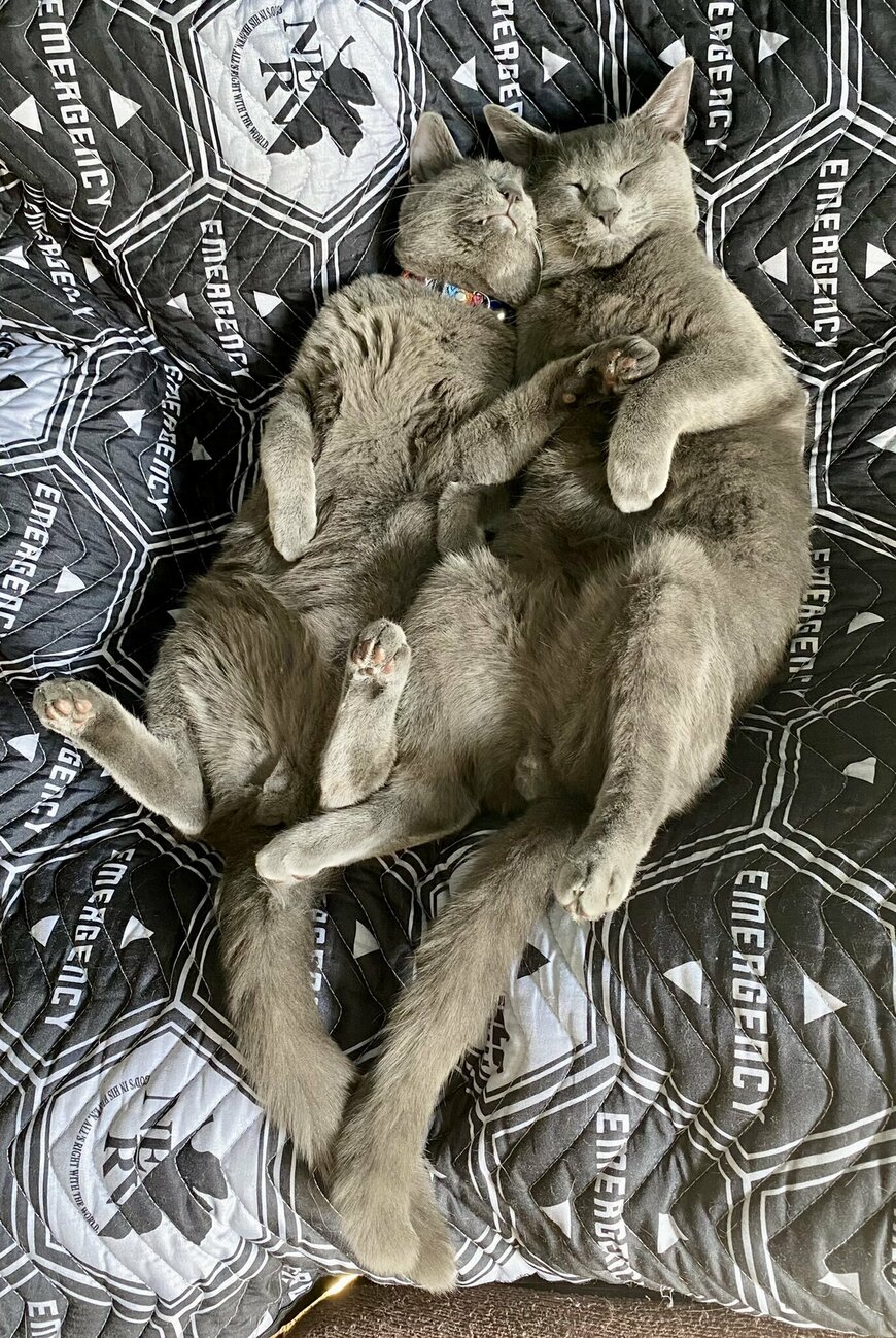 2匹の猫ちゃんは、グレーの毛並みに顔の形、体格……なにもかもがそっくり!見た目だけでなく、お腹を丸出しにした無防備な寝相も、うりふたつです。