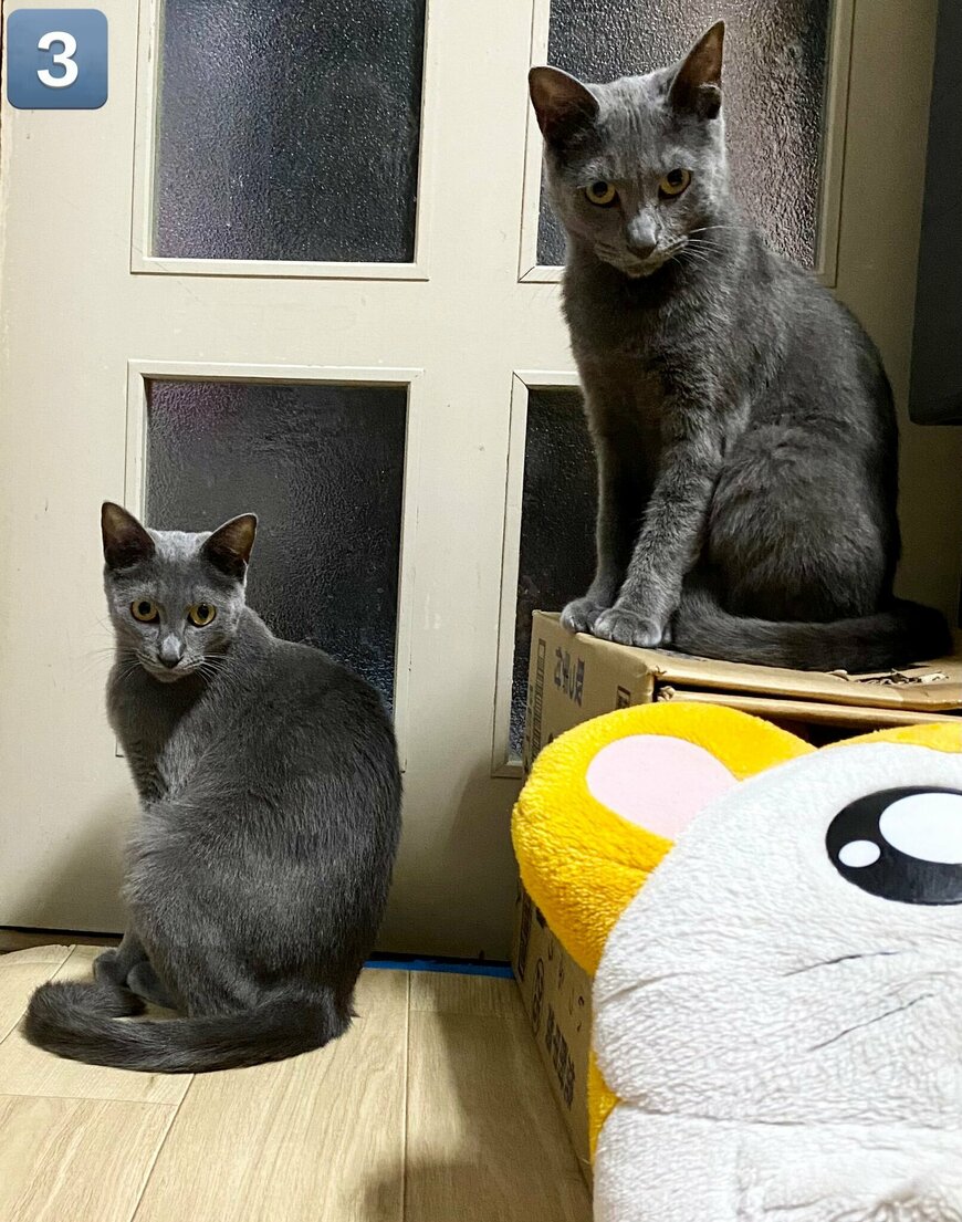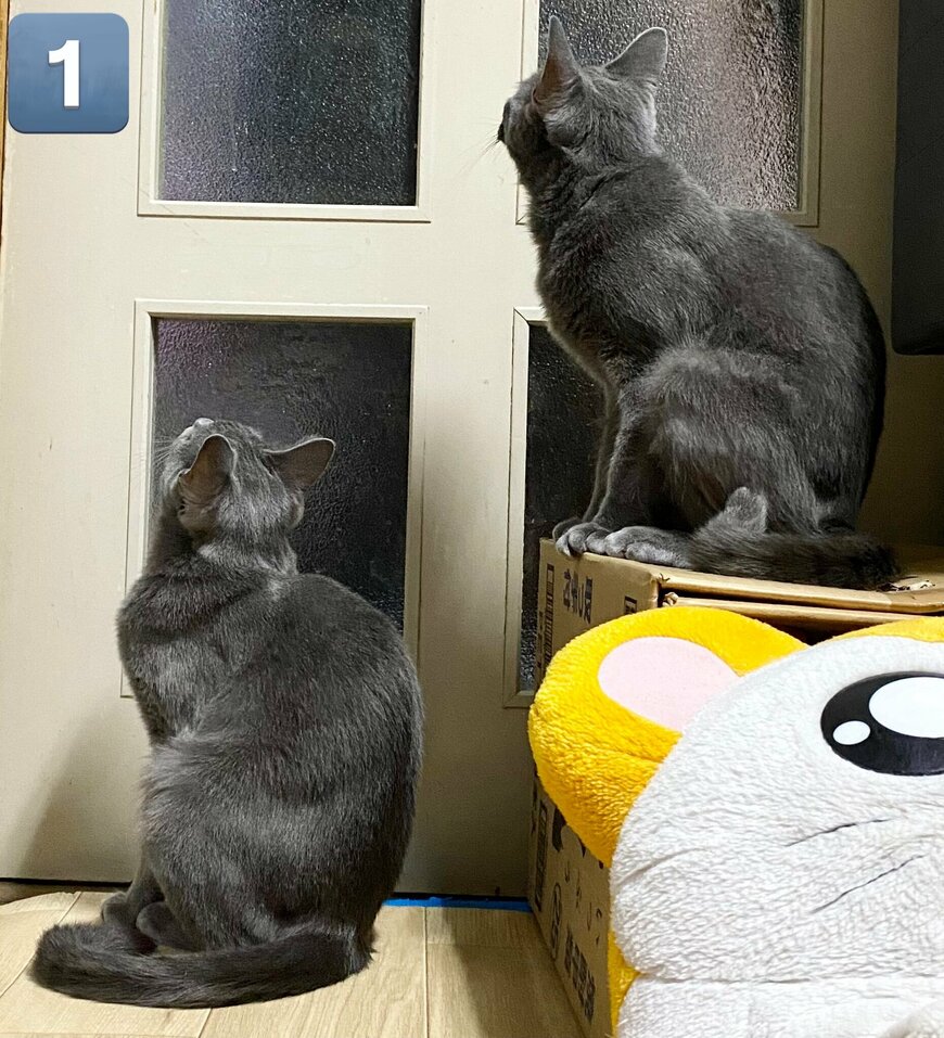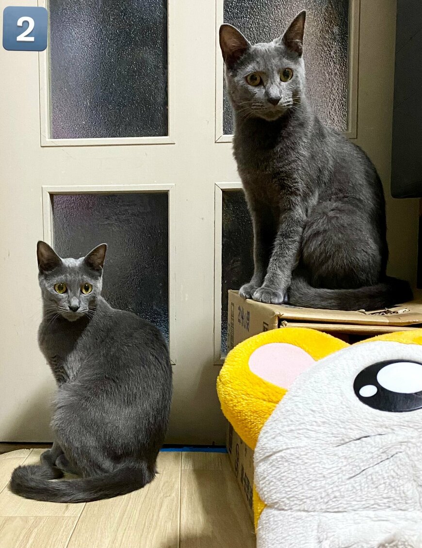 写真に写っているのは、2匹の兄弟猫ちゃんです。トムとジェリーに出てくる「トム」のような灰色のボディが目を引く2匹。そして3枚の写真には、見事すぎる「3つの同じ動き」がおさめられていたのです!
