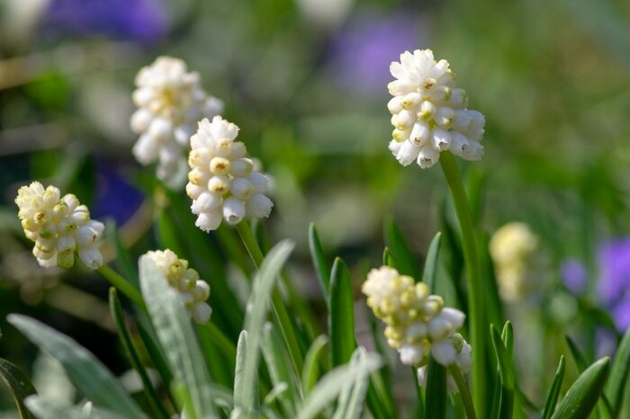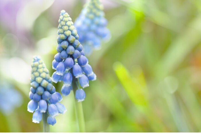 品種改良が盛んなムスカリは、近年オシャレなカラーが増えている多年草。美しいブルーや、ホワイトとブルーのバイカラー、パープルなど、爽やかな色合いが多いのが魅力です。