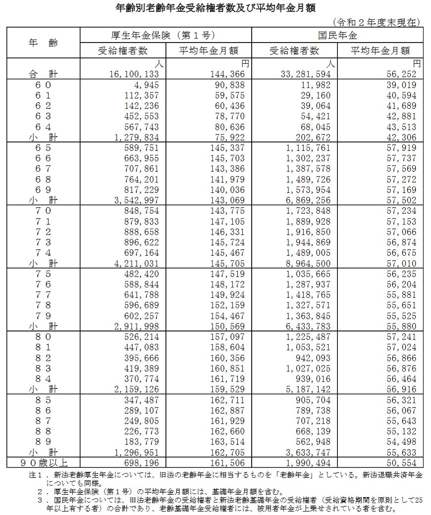 厚生労働省「令和2年度 厚生年金保険・国民年金事業の概況」 を参考に、年金受給額の月額平均を1歳刻みで確認していきましょう。