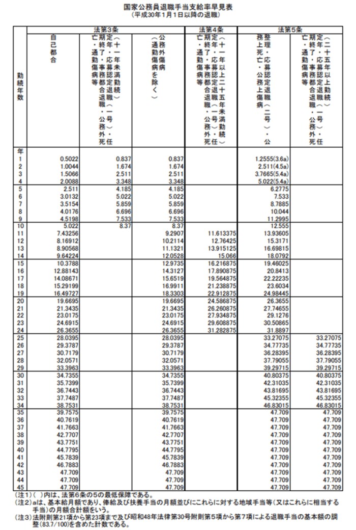 内閣官房の「国家公務員退職手当支給率早見表 (平成30年1月1日以降の退職)」によると、退職金の支給率は以下のように決められています。