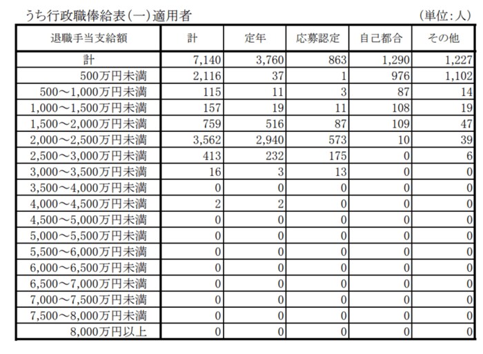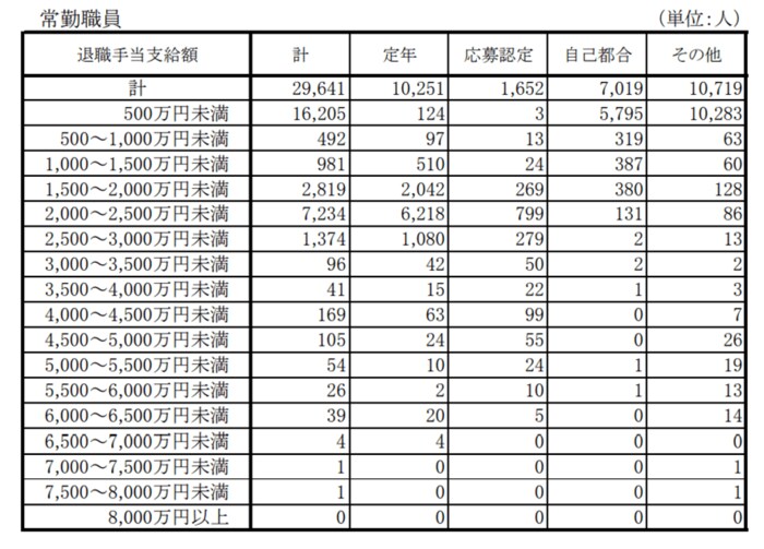 中には退職金として5000万円以上を受け取る公務員もいます。内閣官房の同資料から、その割合を見ていきましょう。定年退職を含む全体を確認します。