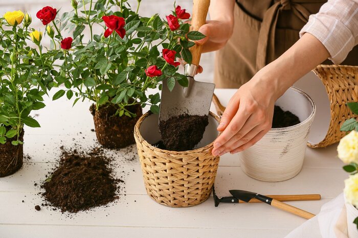 用土は赤玉土に腐葉土や堆肥を混ぜて、保水性と排水性のよい土壌を作ります。初心者にはバラ専用の培養土がオススメです。